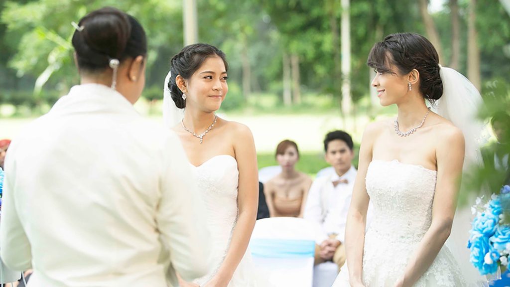 Our two non-threatening homosexuals to root for are Pim, a woman with a long-term boyfriend who wants her to move to Japan. However, before this happens, she meets Pat who has been nursing a crush on her. The two women grow closer as Pim and the boyfriend drift. Eventually, Pim and Pat enter in a relationship. Unable to get legally married under Thai law, the two women still hold a commitment ceremony and start a life together. For a while, they happily live their life before tragedy suddenly strikes.