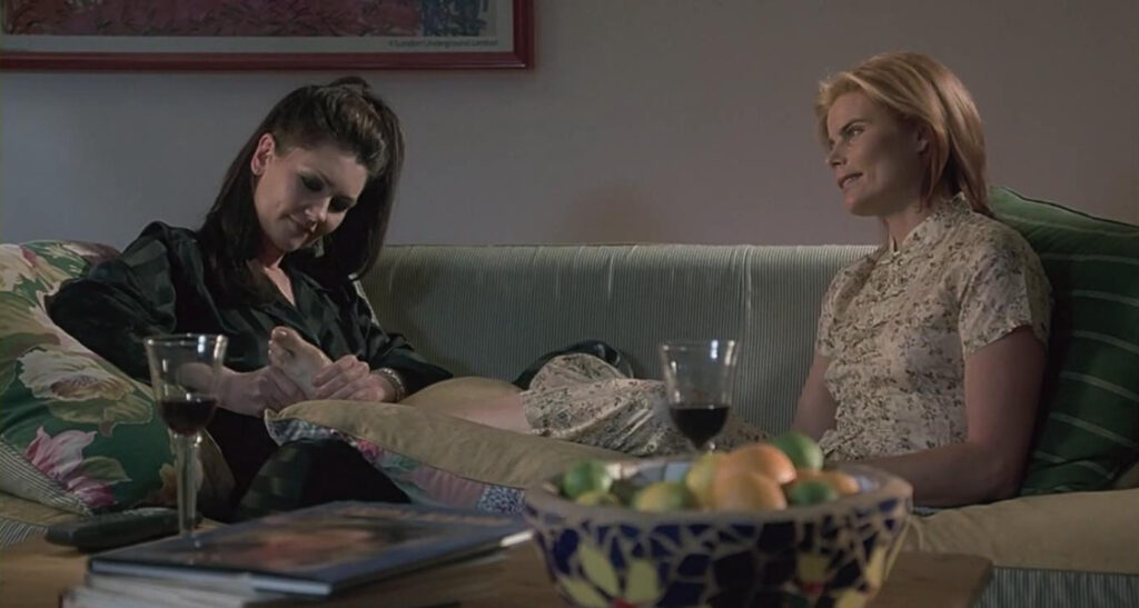 The film unavoidably fetishizes lesbianism. That’s basically the premise of the movie. Remember kids, women sleeping with women is fine as a male fantasy but a problem if it’s a female reality. Admittedly, there are some moments that might be considered forward-thinking. Early in the film, Laura and Marty discuss whether Didi is gay. Marty suggests that maybe she’s bisexual says, “we like bisexual”. So hey, thanks for not only using the word bisexual but in a positive way, I guess? At the end of the film, Didi also has a solid moment where she goes after Marty and men as a whole for how they treat lesbians. She correctly gets after him for thinking lesbians are fetish objects who actually like cock and are just waiting around for a man to show up. Still, these moments are very much watered down by all the overt lesbian fetishization.